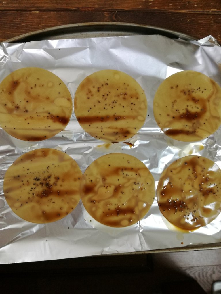 ②フライパンを熱してごま油をひき①を皮目を下にして中弱火で焼く(約5分)。皮がこんがりしたら返して全体がこんがりするまで焼く。