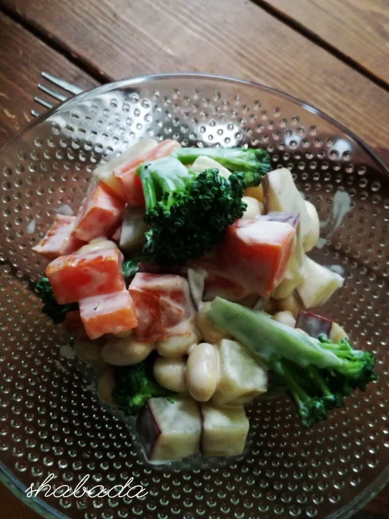 2017年06月27日 止まらない♪デパ地下風デリサラダ おはようございまーす(*^ー^)ノ♪ くんきんです。 今日は、大豆の水煮と 野菜をたっぷり使った 栄養満点サラダをご紹介します。 大豆と野菜のデリサラダ まごわやさしい、の、ま(豆類)、や(野菜) デパ地下で良く見かけるデリサラダを参考にしました。 大豆の水煮は冷凍ストックを、 野菜は茹でるよりも 蒸した方が断然おいしい! それぞれを別々に茹でるよりも 手間も省けるので一度に蒸しました。 味付けは、マヨネーズとヨーグルトを1:1と塩、胡椒... マヨネーズに ヨーグルトを加えたので、 ものすごーく、まろやか♡ 食べ始めると お箸が止まらなくて忙しいので、 スプーンに替えました(笑) 大豆と野菜なので、 いくら食べても罪悪感なし^^ ヘルシーで栄養満点! とーってもおいしいので、 良かったらお試しください♡ 下のバナーをクリックしていただくと ランキングへのポイントが入る仕組みになっています。 押していただけるとものすごく嬉しいです💓 ↓ ↓ ↓ にほんブログ村 家庭料理ランキングレシピブログに参加中♪ いつもありがとうございます♡
